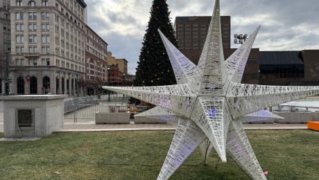 Peaceful. The tree and the Nativity scene look cozy indeed this holiday week in Syracuse’s Clinton Square.