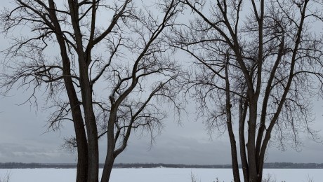 Breakin’ on through to the other side. The observation deck still looks out to the far side of our lake, even though snow covers everything this frosty winter. It will be a while before boats venture out there, I think, watching smoke come from the far stacks.