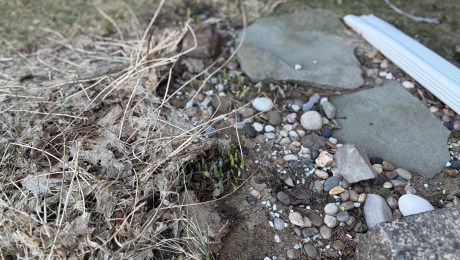 Finding the warmth. Our little rock garden outside the front door has found its first signs of green this March, too.