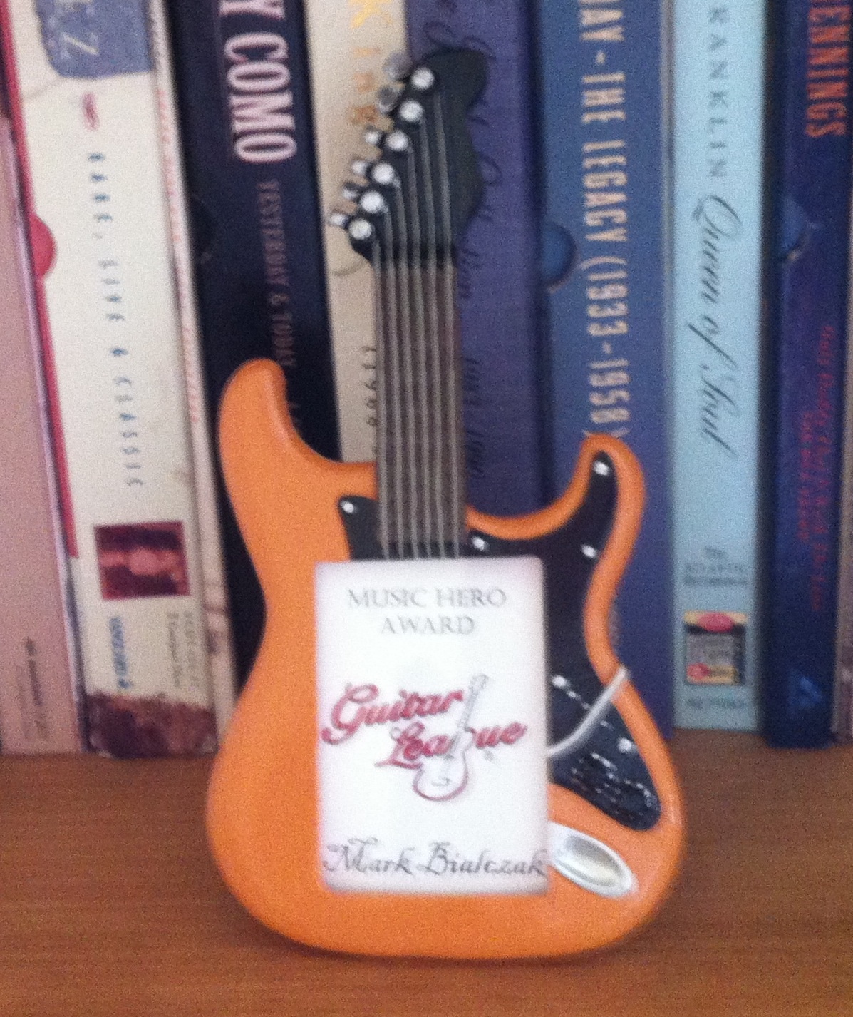 The good Guitar League folks included me with a couple other people honored with a very cool trophy. My very smoking little guitar reads “Music Hero Award” for the ink and Internet space I’ve give the league over the years. Truth is, writing about well-intentioned people sharing their love and wisdom for music and their instrument has been my pleasure, every single time. So, thank you, thank you, thank you.