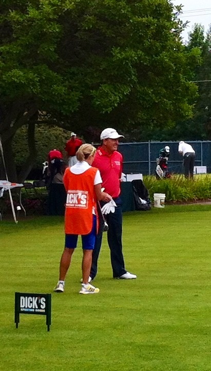 We followed Fred Funk, with wife Sharon carrying his bag. We talked with Ken and Cindy Barber, and smiled at daughter Kayla’s cute toddler, last seen giggling his way up an empty fairway with grandparents and parents ready with his stroller.