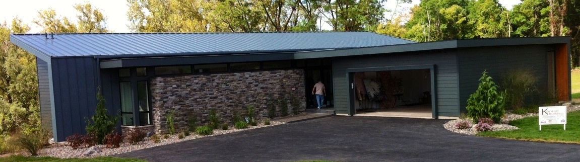 The low-slung house indeed looked like it would feel quite at home out there on the left coast. From the curb, it spreads wide, one-story high, garage on the right side of the angle, stone facade almost the entire width of the house side, tin roof on top. Inside, you saw a second level of living — with the kitchen and living area — down below, for 3,000-square-feet to fill every need.