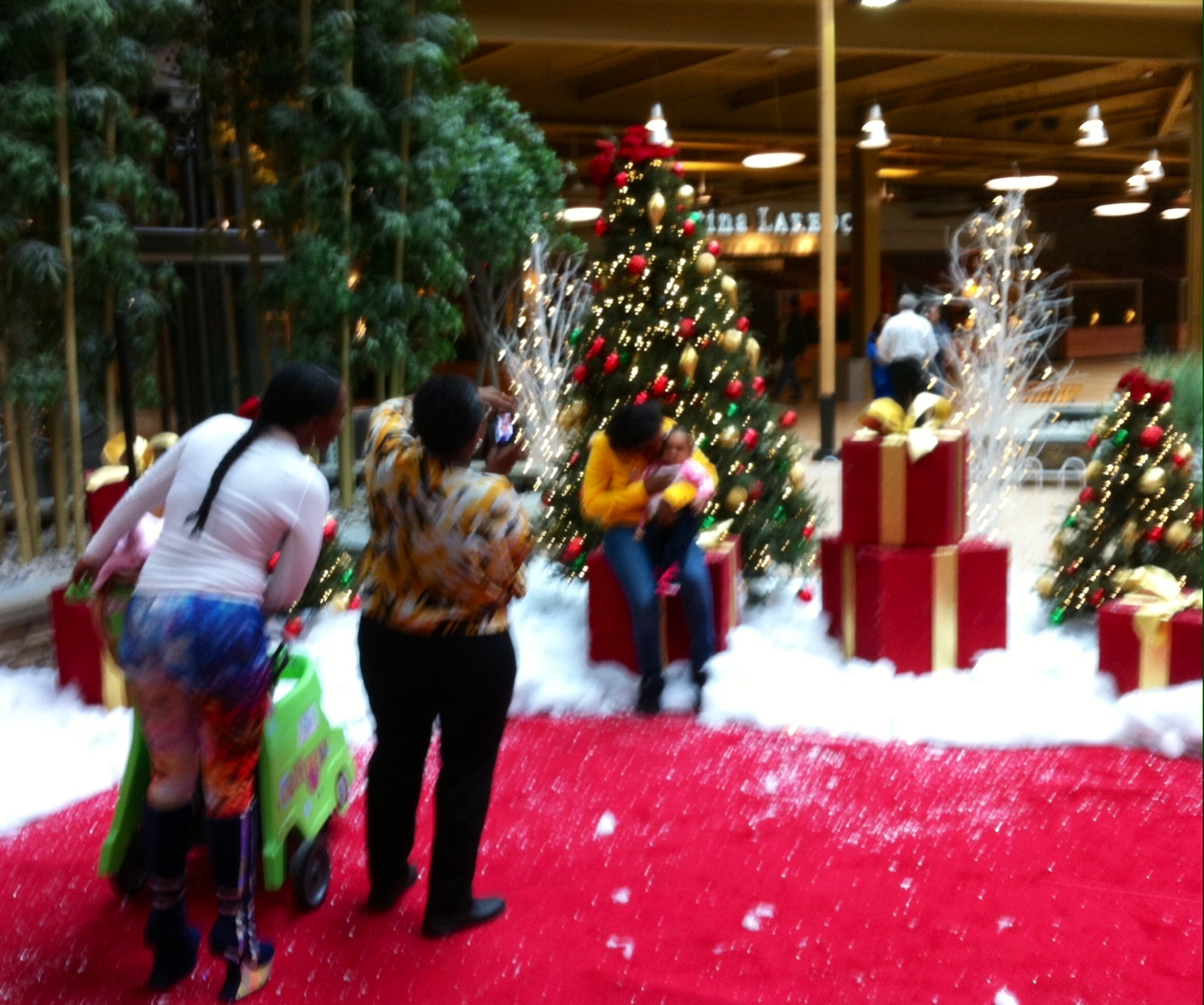 A family had already decided that this Thursday, exactly three weeks before Thanksgiving, was the perfect time to sit their little one down on a matriarchal knee to take pictures with all those wonderful decorations as the backdrop.