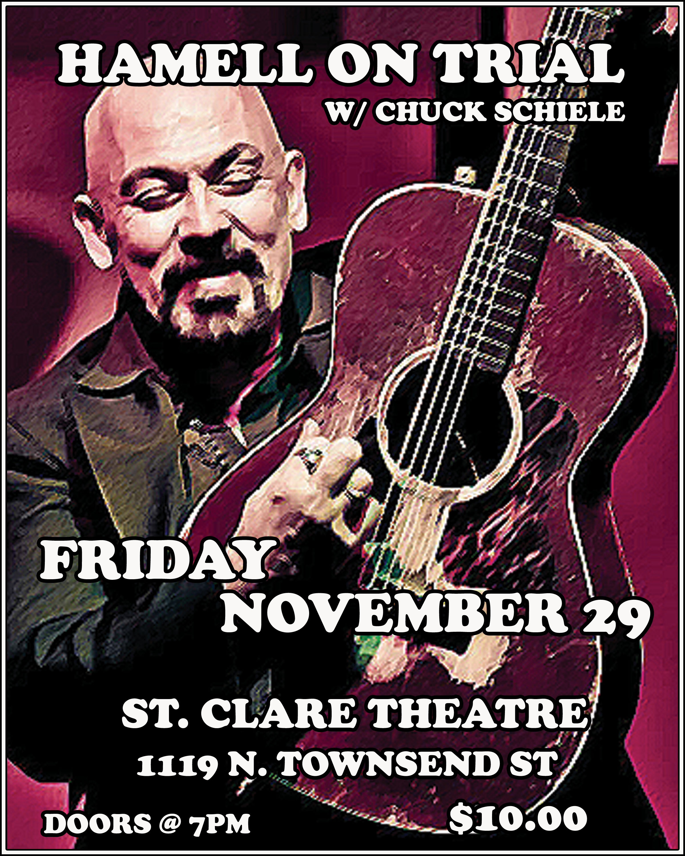 On Friday night, Hamell on Trial is playing at the St. Clare Theatre on North Townsend Street. That’s the extremely compelling one-man show from the guitar, voice and brain of Central New Yorker Ed Hamell. Back in the day, Hamell played in some popular Syracuse band with some equally talented local musicians. Then he got the traveling bug and hit the road. He’s been a big tourer since, seeing the world and country on his own and opening for good friend Ani DiFranco. (Her Righteous Babe site labels his sound as rant ‘n’ roll.) He’s overcome a serious car accident. He’s not afraid to write songs about whatever is on his mind. He plays guitar and sings with passion of a punk rock band, all alone with his acoustic guitar. Lyncourt neighborhood guy Chuck Schiele opens. Tickets are $10, and the doors open at 7 p.m.