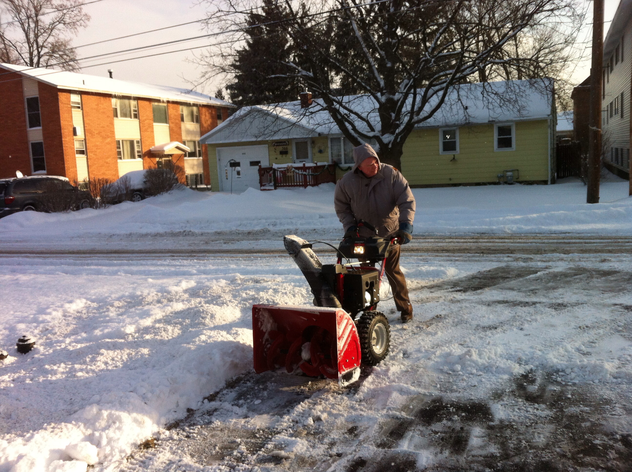 Good Neighbor Tim uses his snow blower to get rid of the hard stuff crushed down over the weekend at the end of the driveway.