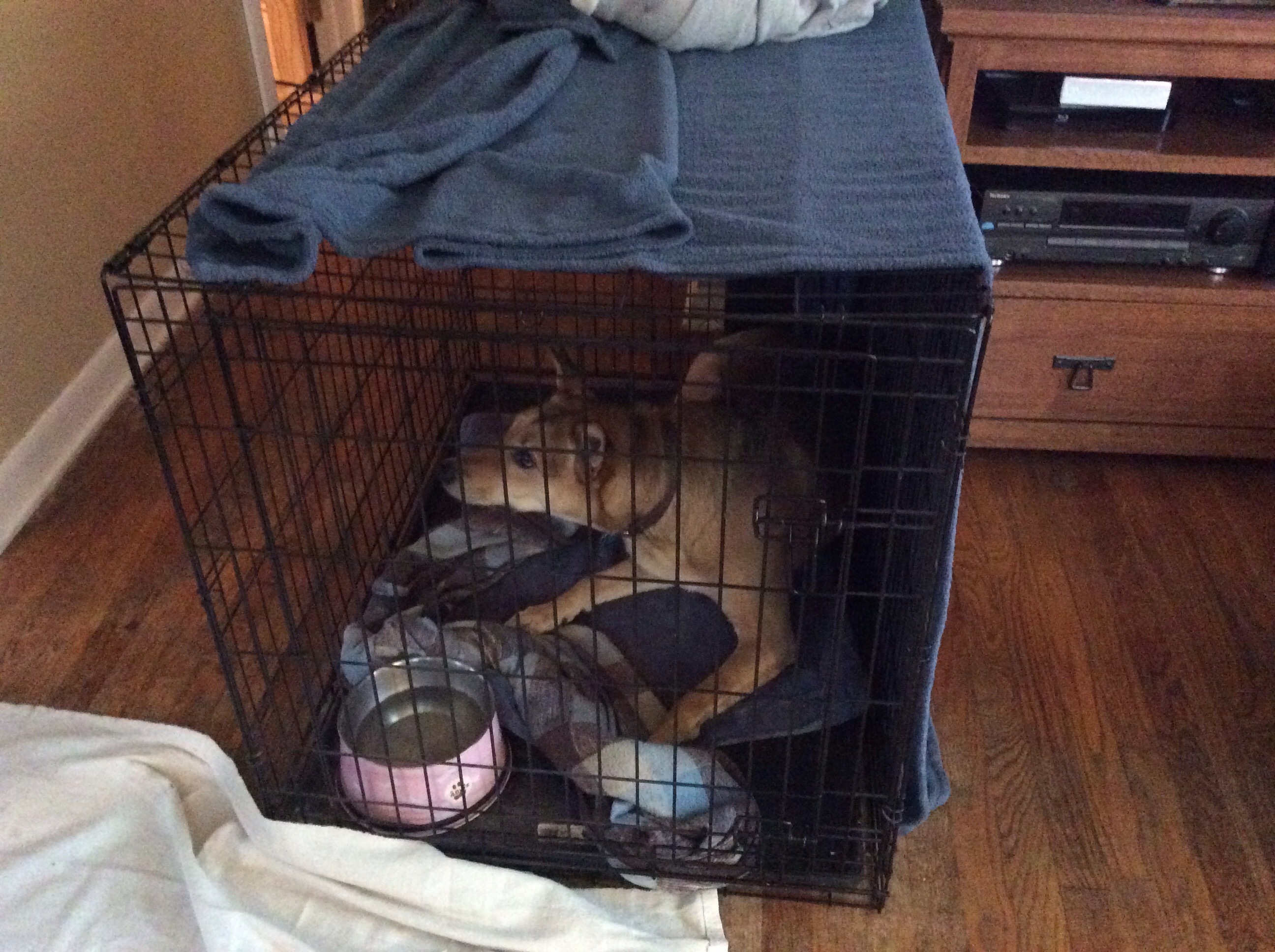 Ellie B, aka Dogamous Pyle, lay fairly patiently in her crate. I sat typing away in my recliner. We were warm because the crew chief and man who’d given us the estimate for this whole operation had kindly brought along a portable electric heater.