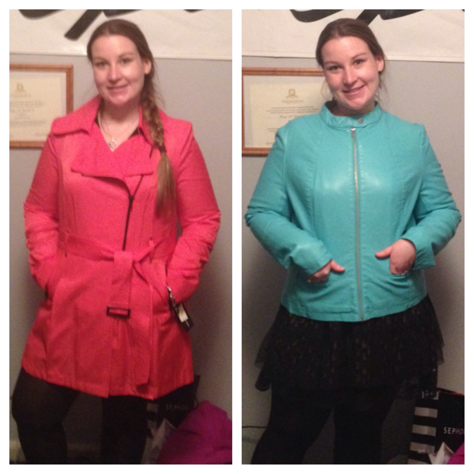 My daughter Elisabeth models the two coats she purchased with my Christmas gift card.