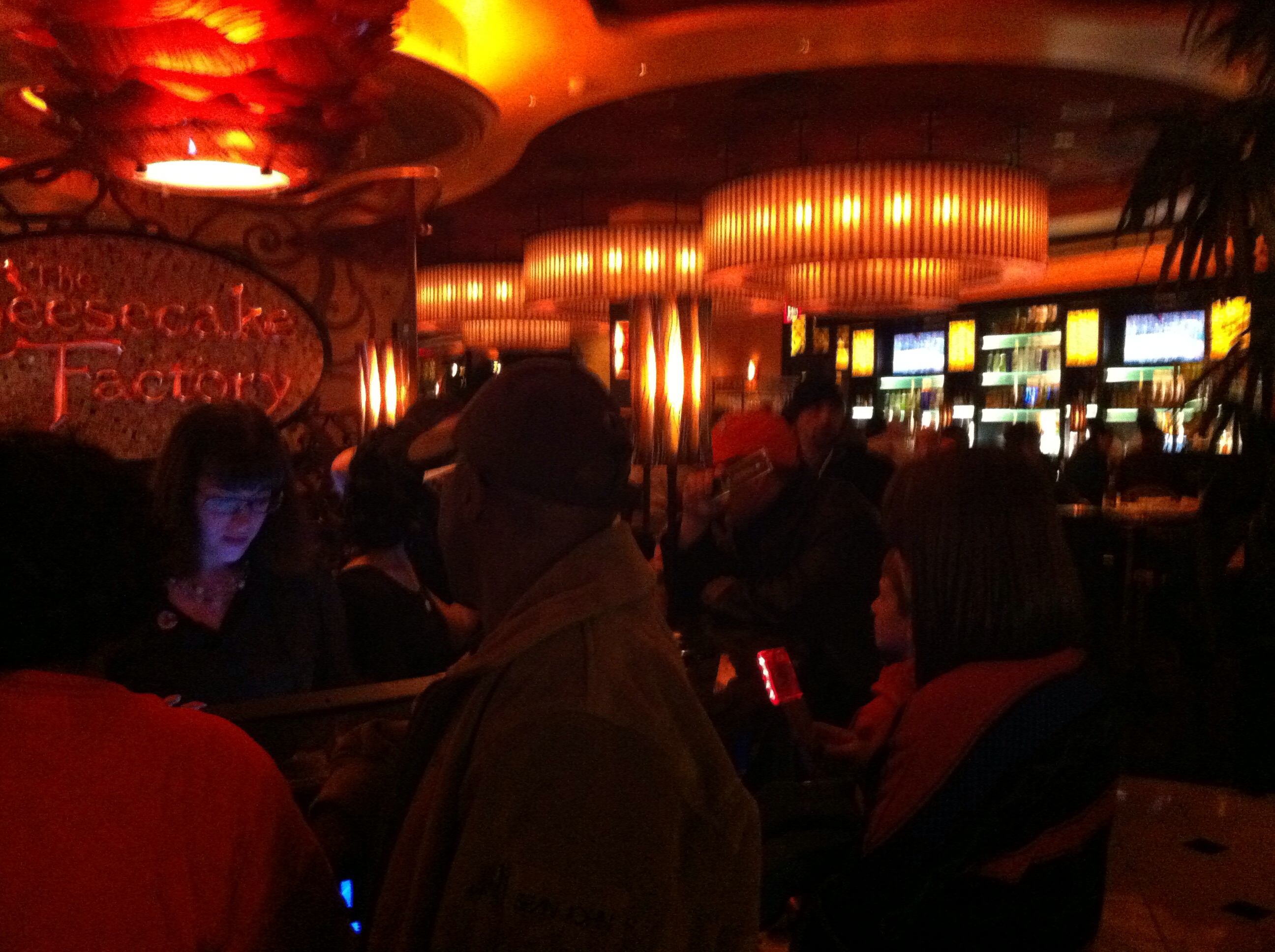 The short walk to The Cheesecake Factory wound through lots of people. The Syracuse-North Carolina State basketball game had just started, and we heard cheering come from the places with flat screens.