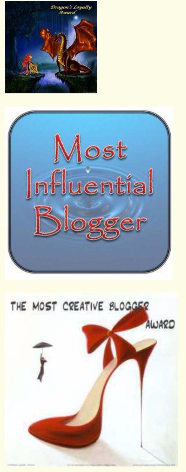 There you have it. I have managed to add some new honorees from my last nomination go-round. That means I’ve left some great blogging friends off. If you’re insulted, please click comment and bawl me out. That way you’re gravatar will still be on this page, and everybody will be happy. If I’ve nominated you and a WordPress Award is the last thing you’d ever want to dive into, please click comment and tell me so. I will promise to never again include you on any said list.