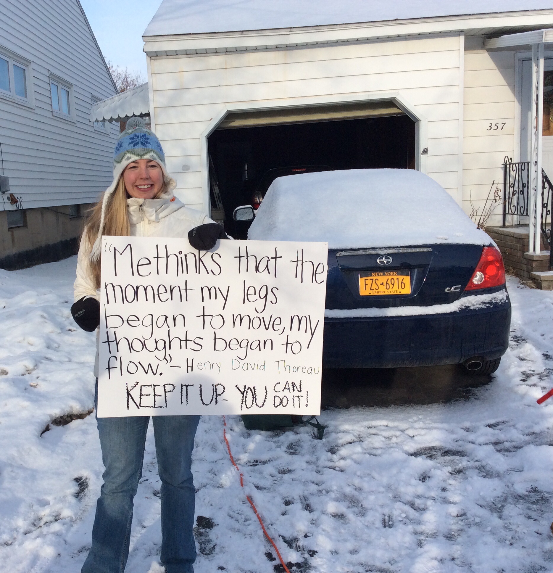 Neighbors were still at the curb to cheer her as she waved and ran.