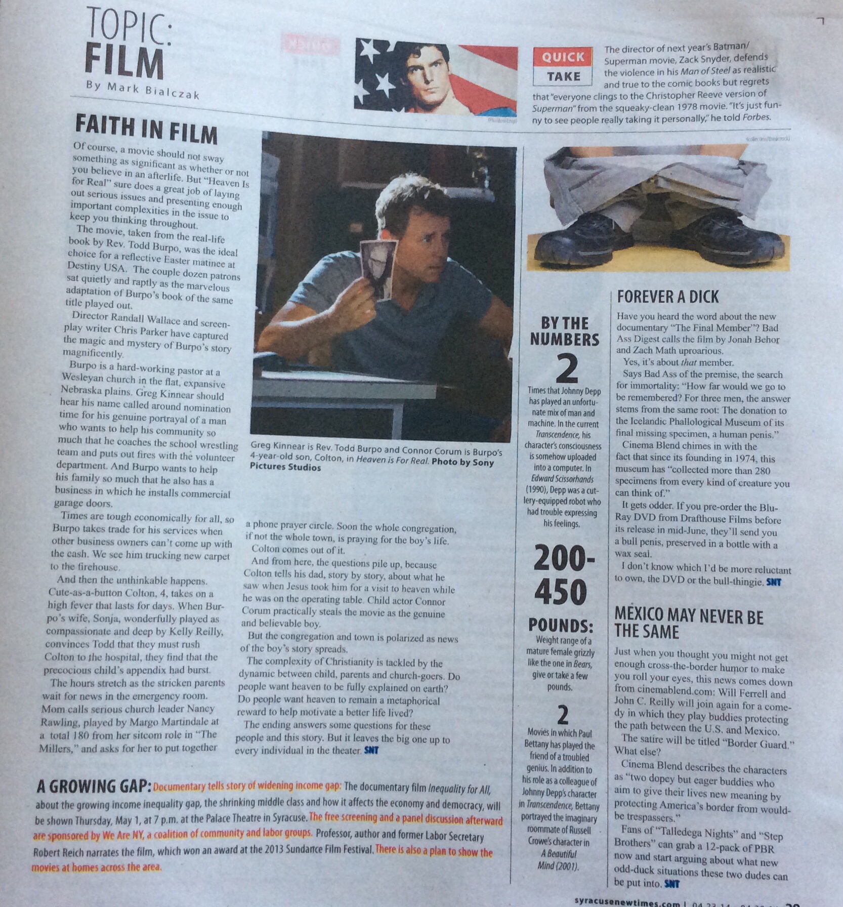 A couple items a week fills the newsprint hole saved for this feature. Yesterday’s edition of the alternative weekly included my review of “Heaven Is for Real,” which came out Monday, and items that I turned in last week. Online first, in otherwords.