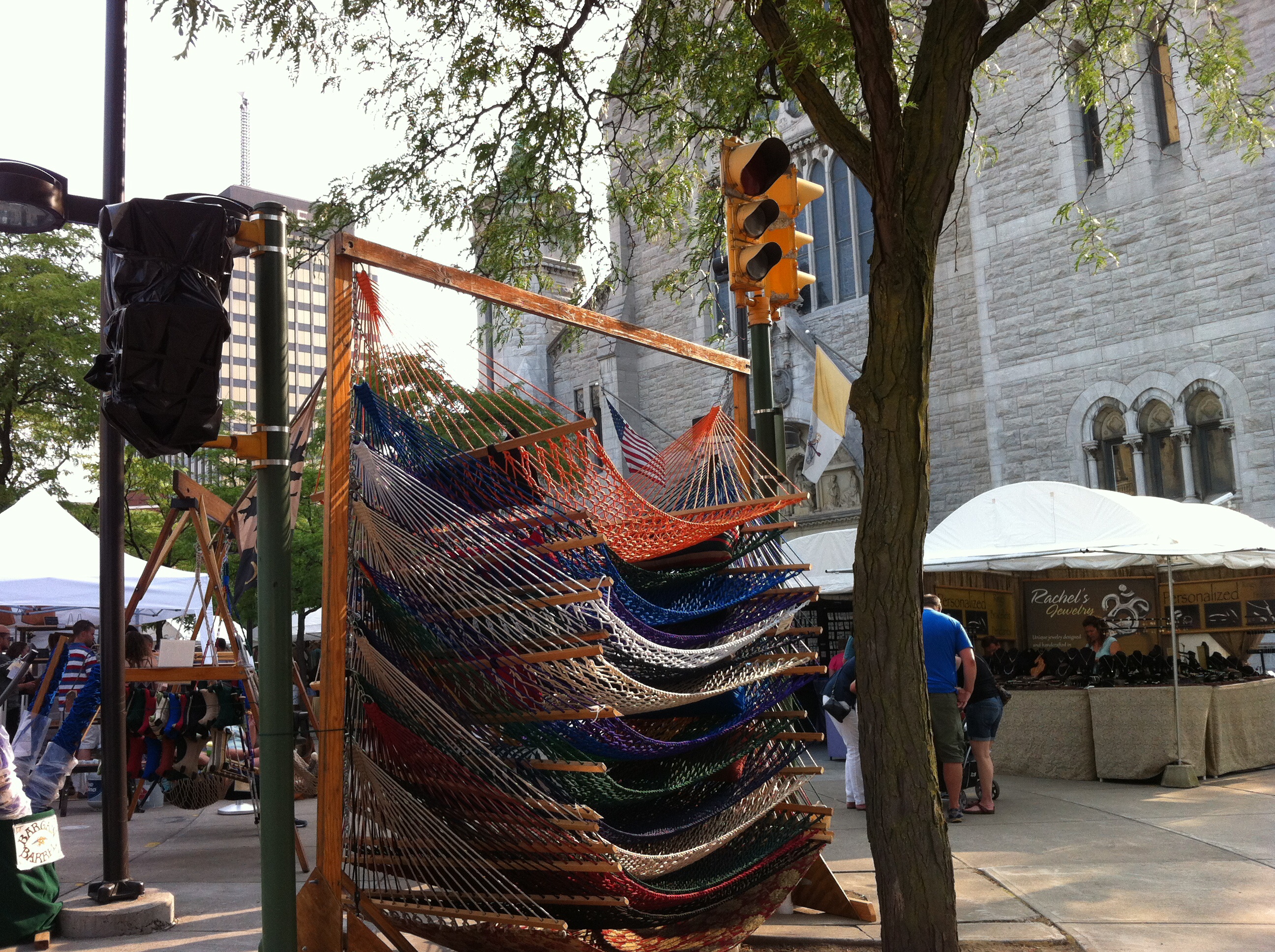 The colorful rope hammocks above were the first sight that greeted me as Karen and I walked to the circle. They’re made be a company from Virginia by the name of Twin Oak Hammocks, and if I had two trees in my yard to tie one two, well … Let’s leave it at that they surely looked as comfortable as they did at home in this arts and crafts fair.