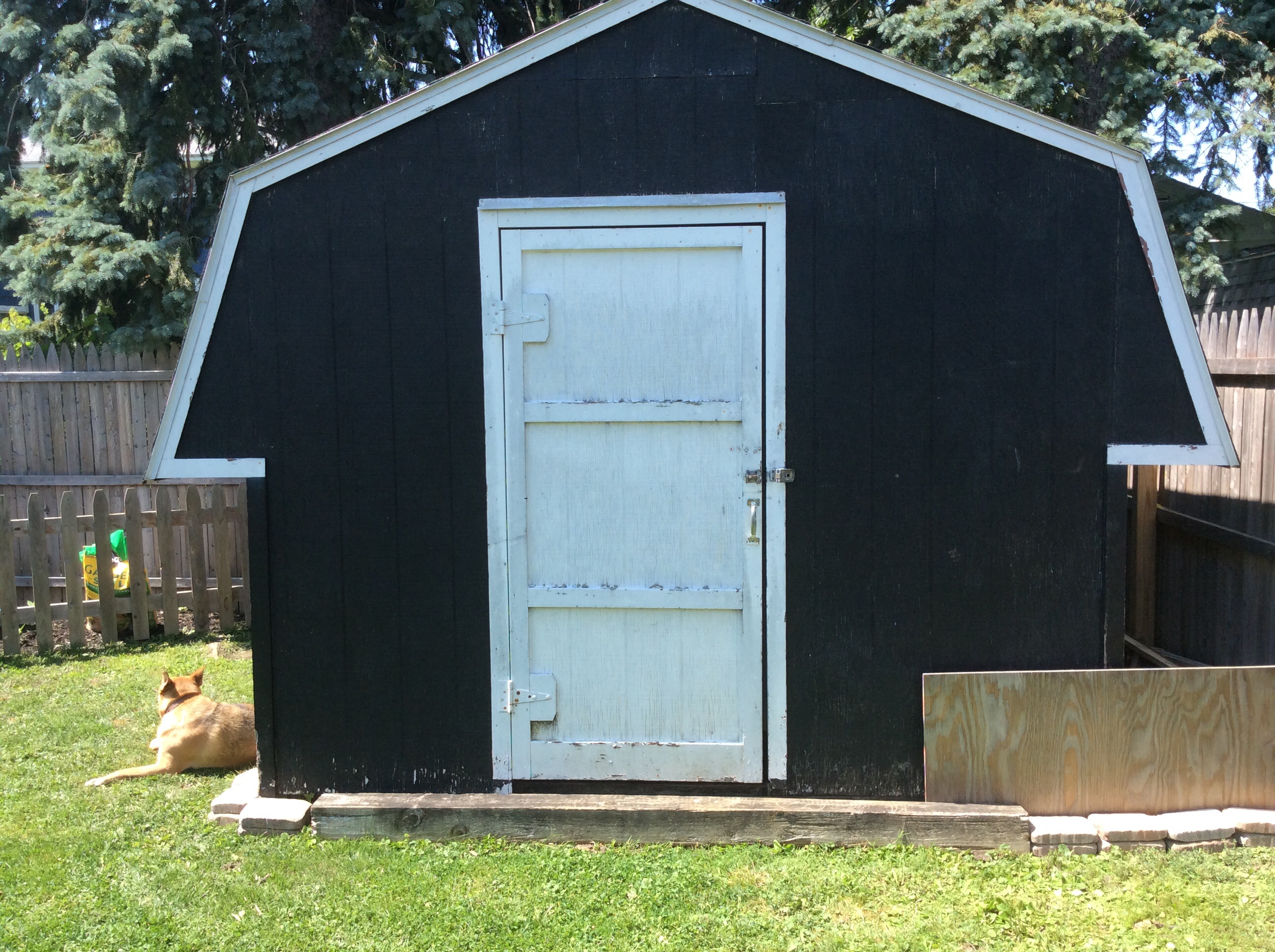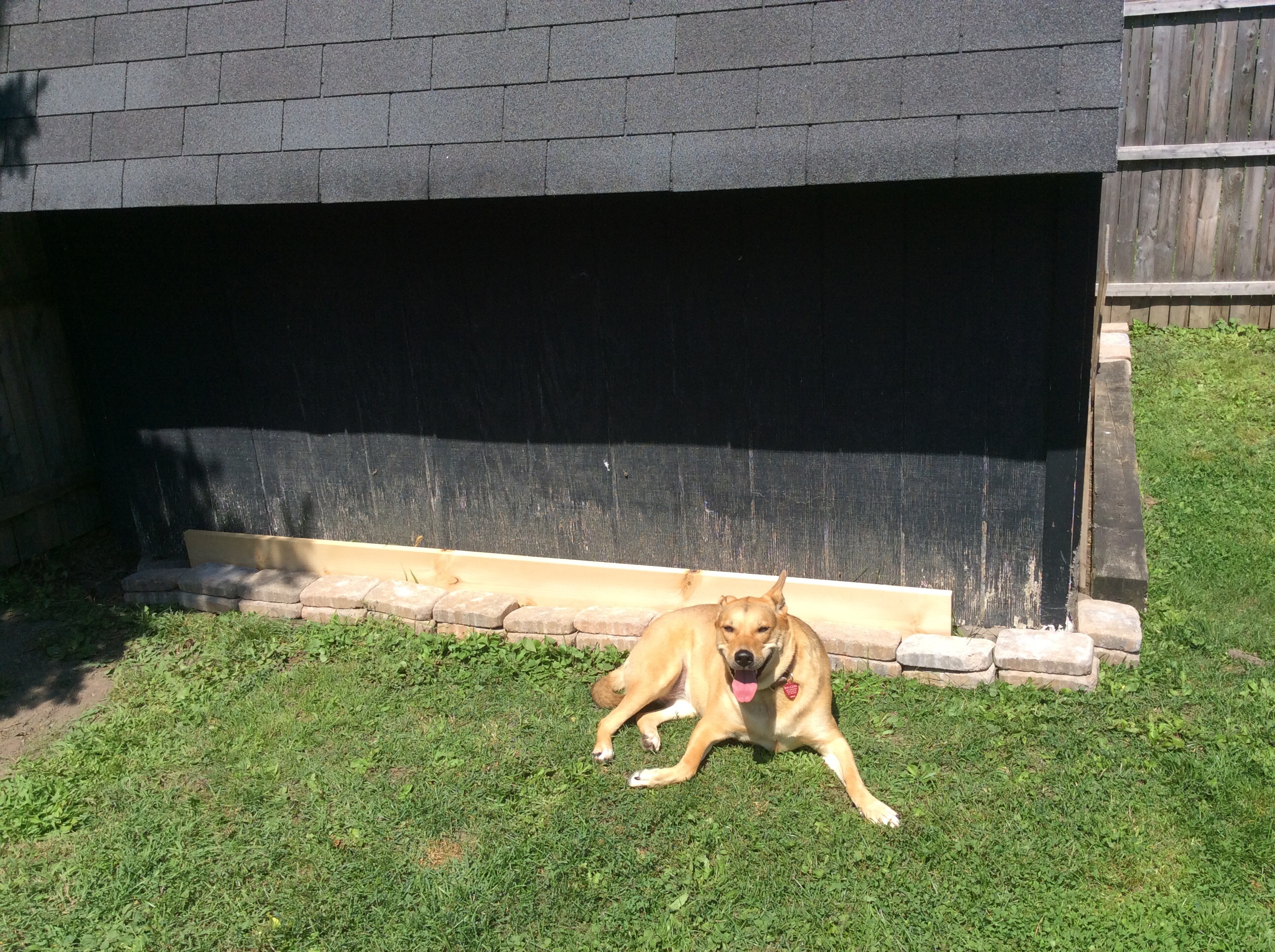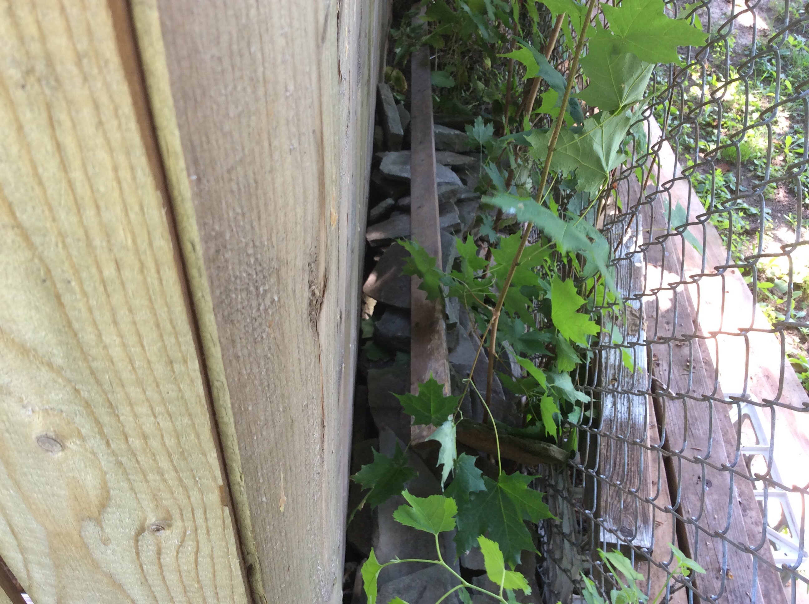The front side had been protected by a sturdy beam. We pulled that out, and I placed a smaller but equally sturdy plank I found on the short side of the shed behind it to further plug the gap, then replaced the big beam. The board at right keeps Ellie B from wandering between the shed and the fence and getting stuck in the eight-inch space between shed and fence in the back.