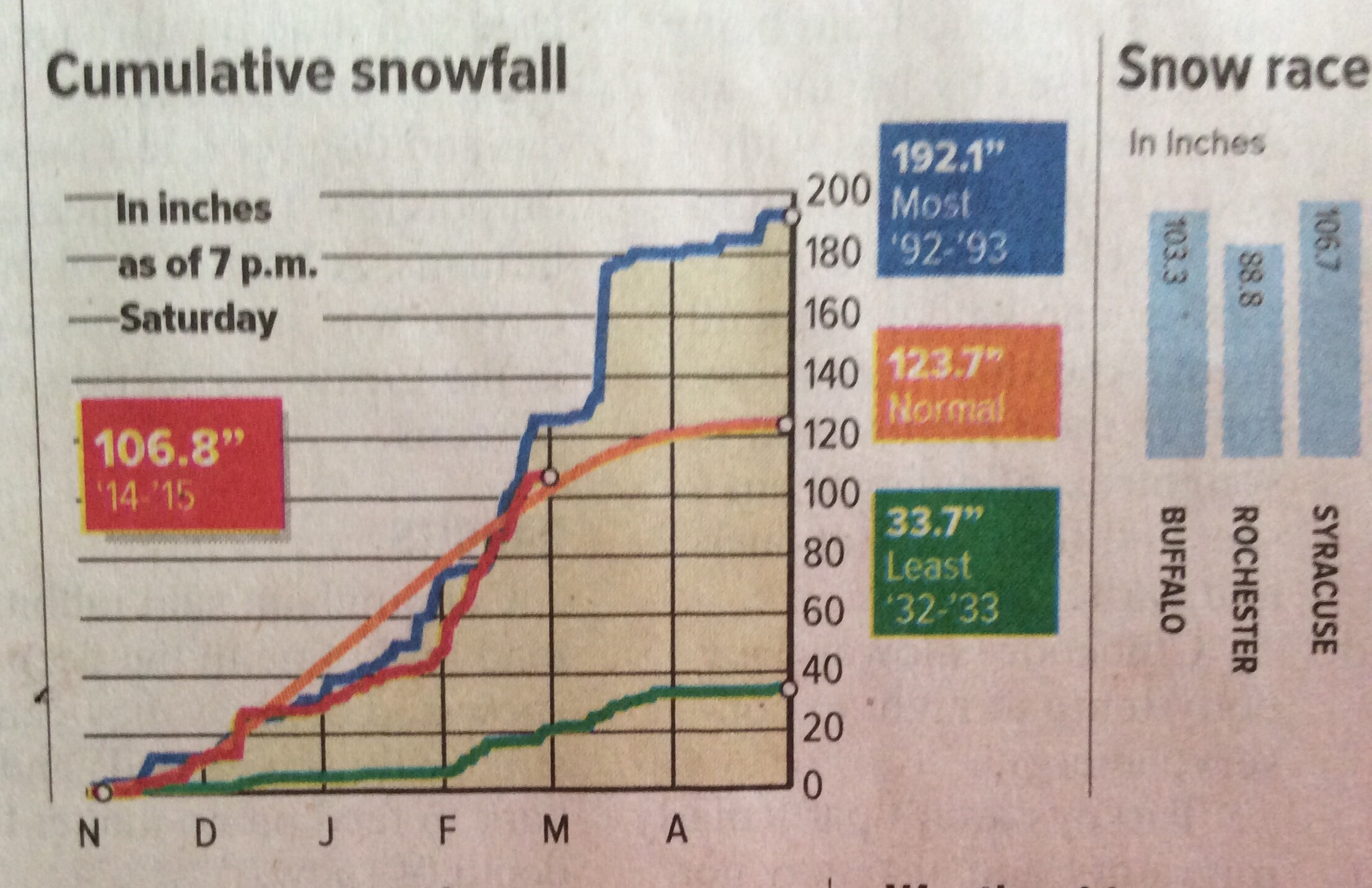 That graphic is just for Syracuse snowfall, Bill. I have a feeling that Boston’s chart would have this winter being the high spike in things, much like 92-93 is for us here. In that storm, I lived out in the village of Morrisville, and I woke up in the morning and hit the automatic garage door opener, shovel in hand, and watched the door go up, and up, and up, and had to wait until there was a foot left up top until I could see sky above the piled snow. I put the shovel back against the wall and called work and said I wouldn’t be in.