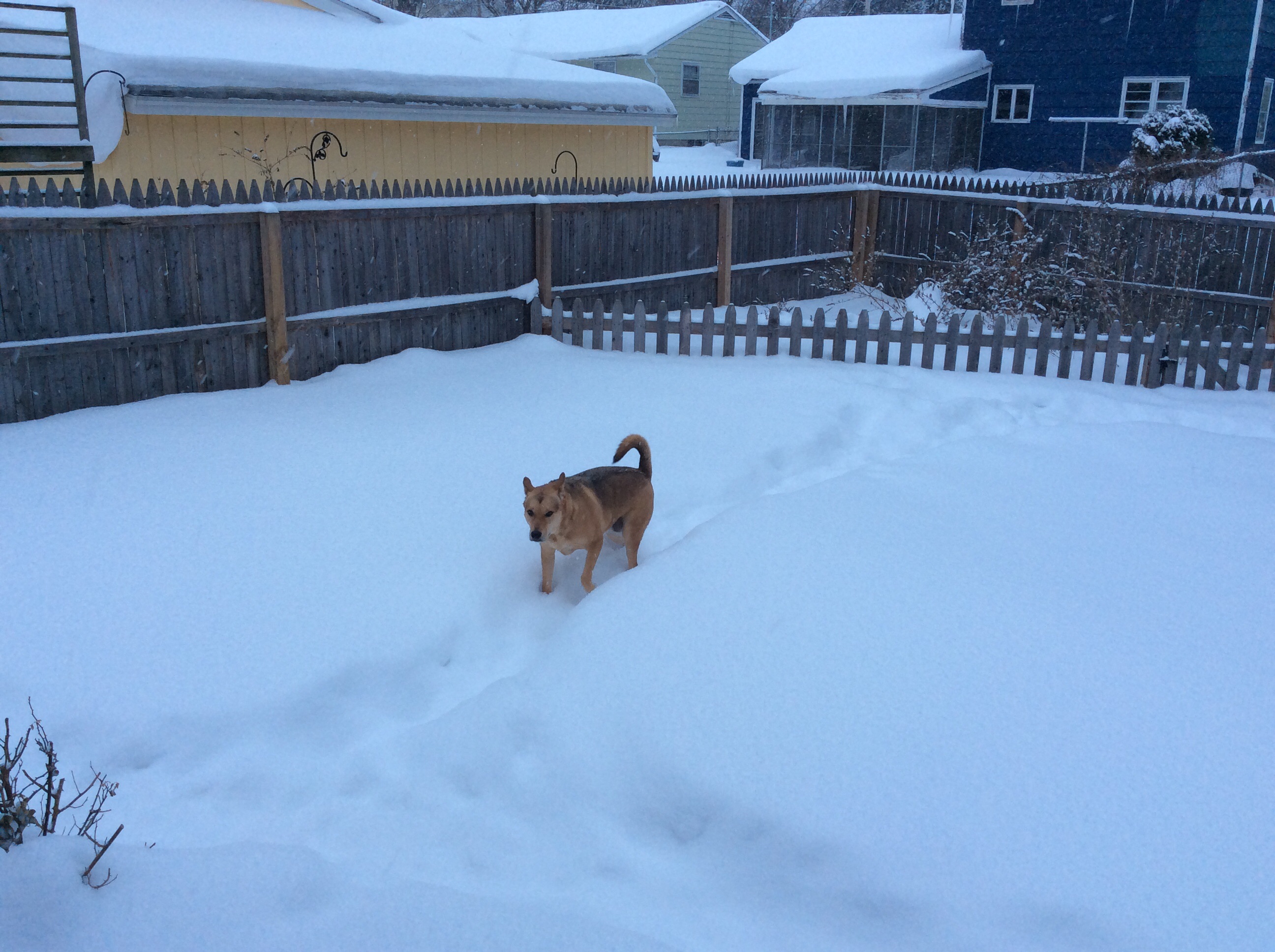 Our beloved rescue mutt Ellie B aka Dogamous Pyle stirred me to be released for her morning ritual off the back porch at 6:58 a.m. Even she seems reluctant to get out in the snow.