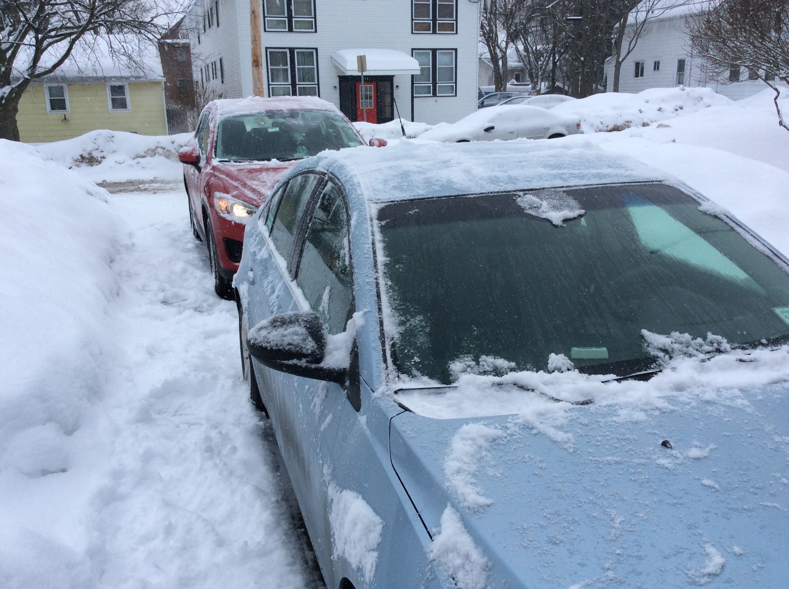 The cars are cleared at 8:26 a.m., and I quickly grab the shovel and get to clearing a path so MDW Karen can walk safely to her driver’s side, and clear the snow from behind the Mazda, too. With merely two or three inches fallen overnight, Good Neighbor Tim has not pulled out his snowblower. When he does, he takes care of the area behind Karen’s car for me.