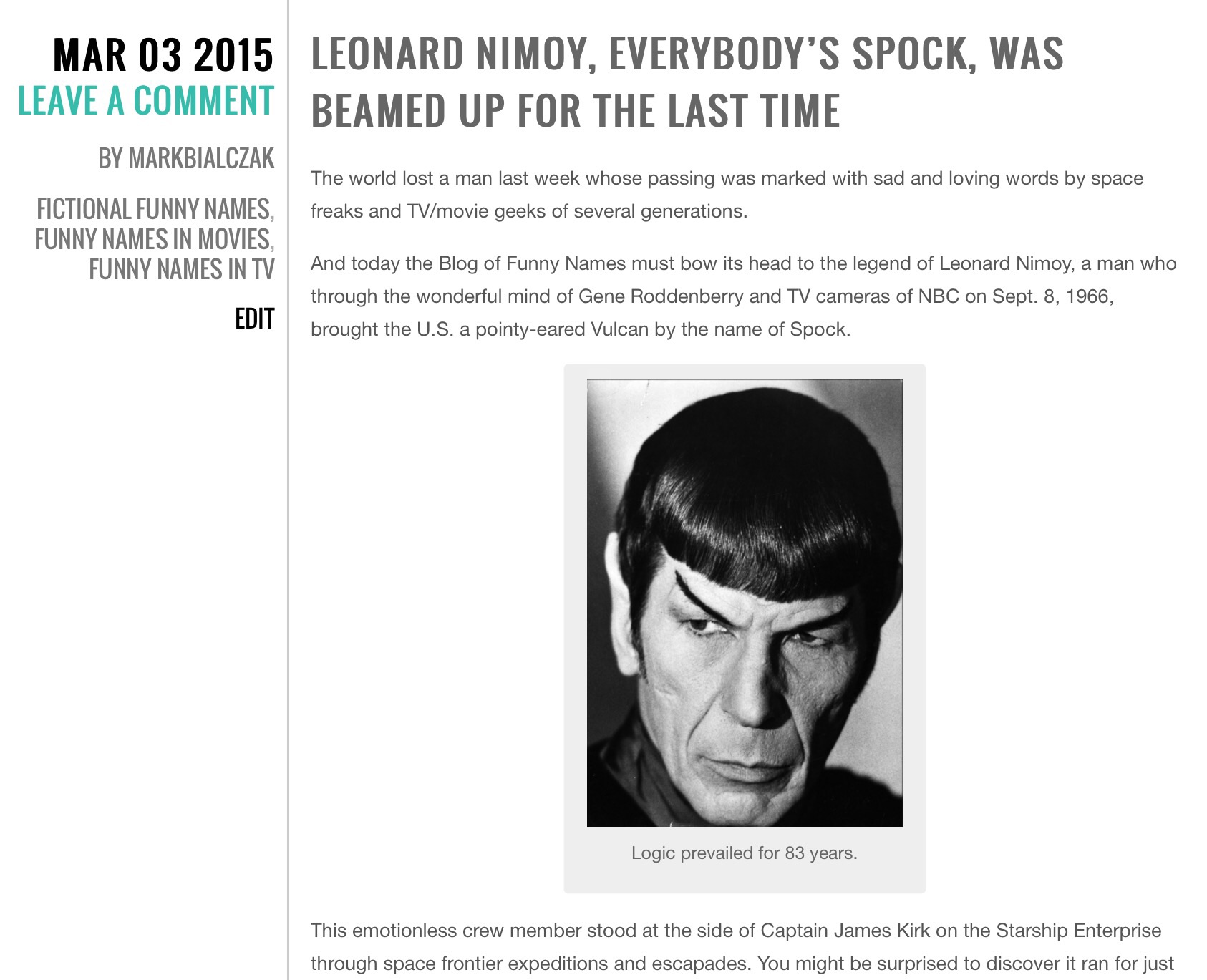 And today the Blog of Funny Names must bow its head to the legend of Leonard Nimoy, a man who through the wonderful mind of Gene Roddenberry and TV cameras of NBC on Sept. 8, 1966, brought the U.S. a pointy-eared Vulcan by the name of Spock.