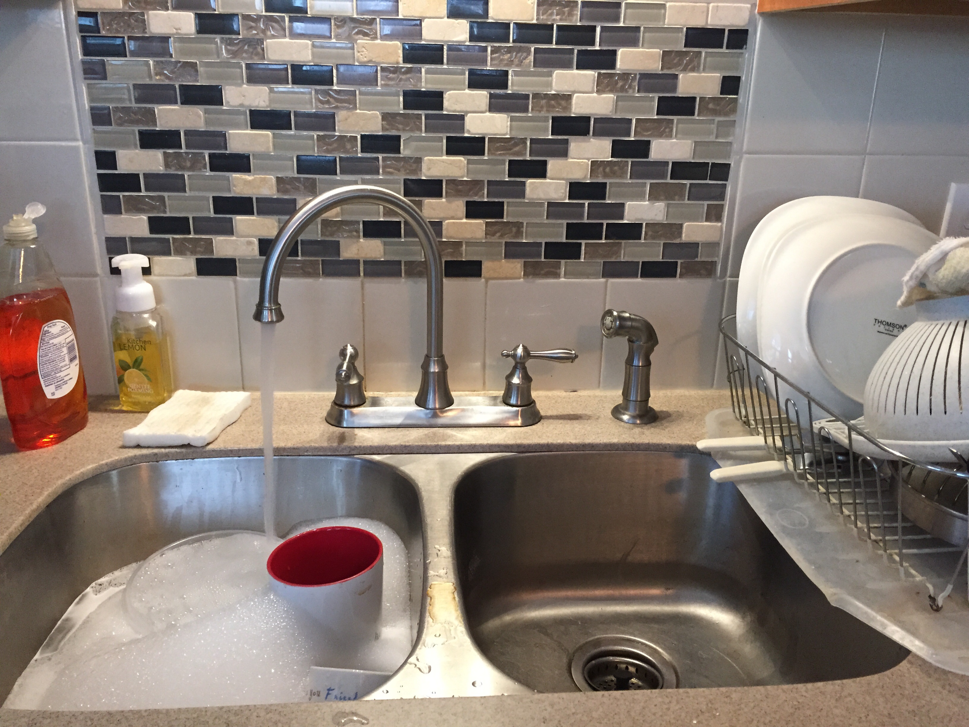I attempted to keep my iPhone 6 at the same distance and level to the sink on each shot. Because I took the horizontal first, had the sink plugged and kept the water running — this was a real life situation, not some staged props — the water level to my coffee cup the size of my head is higher in the vertical photo.