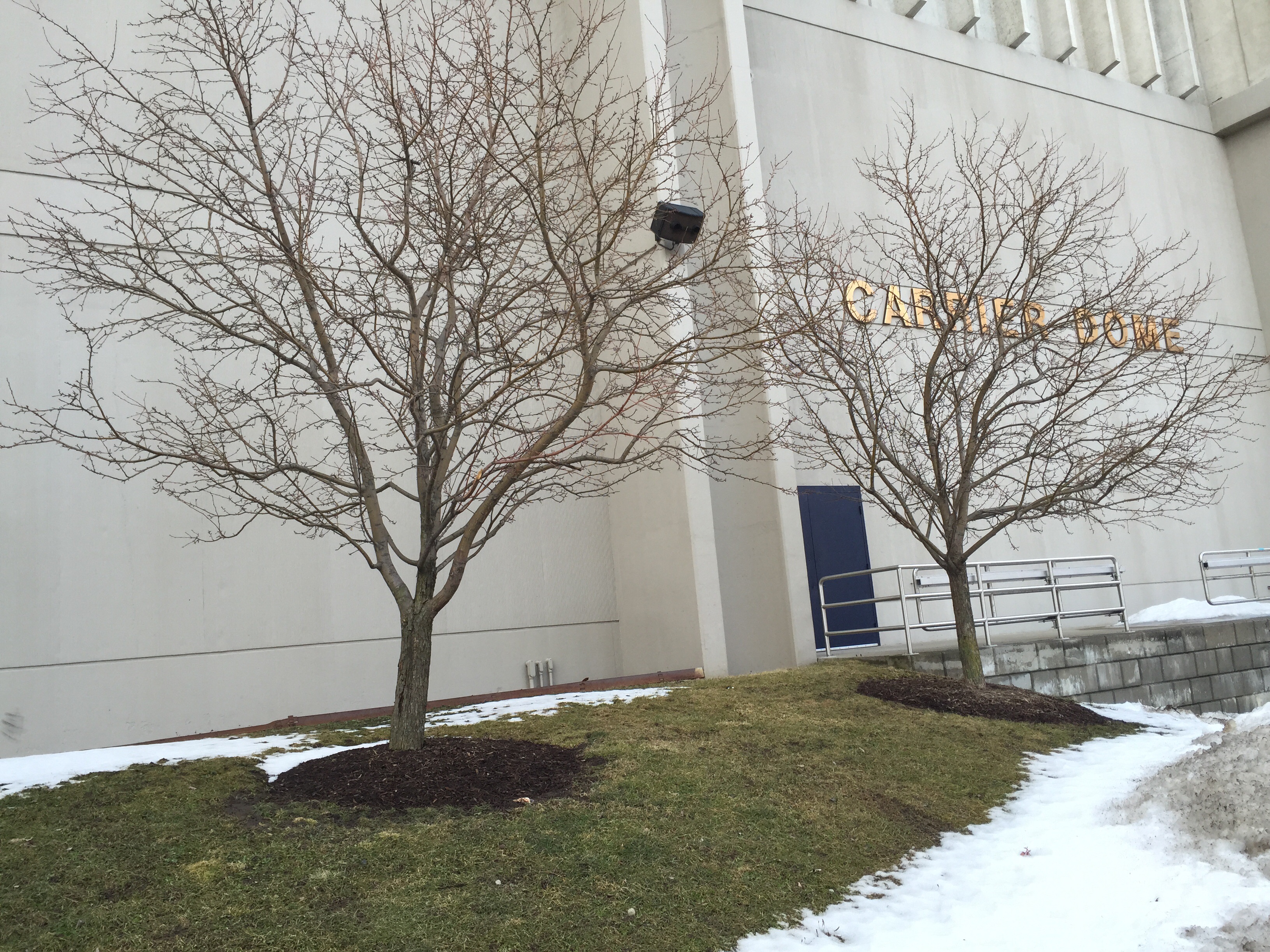 With the spring melt in process on the college campus, I noticed a series of trees quite close to the dome finally laying claim to a rectangle of green grass instead of the huge piles of white snow that have buried us here in upstate New York since it became 2015. The trees look small compared to the big stadium that houses the Orange football and basketball teams, I thought.
