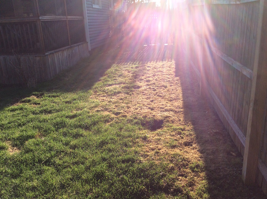 Yards are patchy, like beards. One summer, we had a plastic kiddie pool that killed the grass for years aftrer we trashed it, so we had to truck in some pallets last year. There’s also a spot where the dogs chase each other in circles until there is no grass, only dirt, and we just gave up there. We do put fertilizer on it. Glad to see green in your yard. And sunlight!