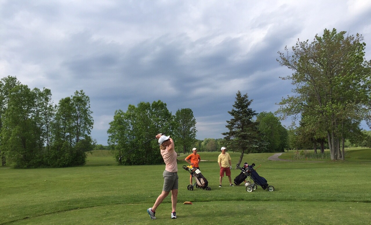 We all hit some good shots, and made it through seven holes before a little bit of rain fell into our lives. We could have continued, but the seventh green is quite close to the clubhouse. So that’s where we went, to sit out on the patio with a beverage, to talk about life.