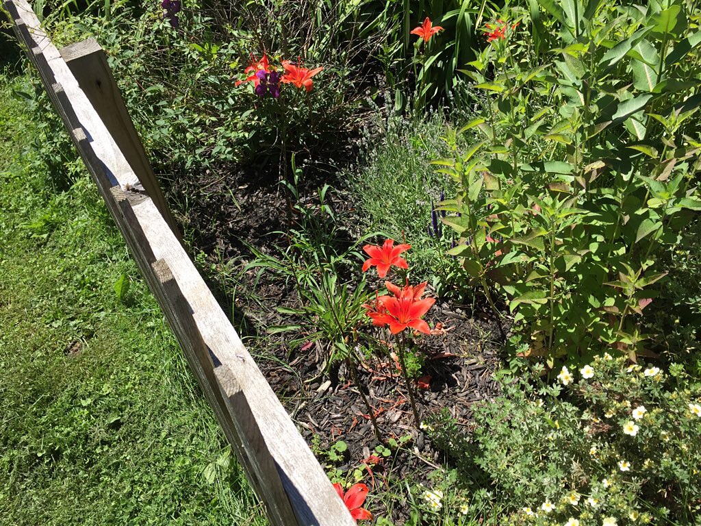 It’s too early for the four butterfly bushes to be anything other than optimistic early brushes with life, but the red border lillies had come up during our vacation, and were hanging out for our return. And the purple of the Polish Plant that’s climbing said cedar fence this season was a fine sight at the line extending from my dear wife’s happy hand.