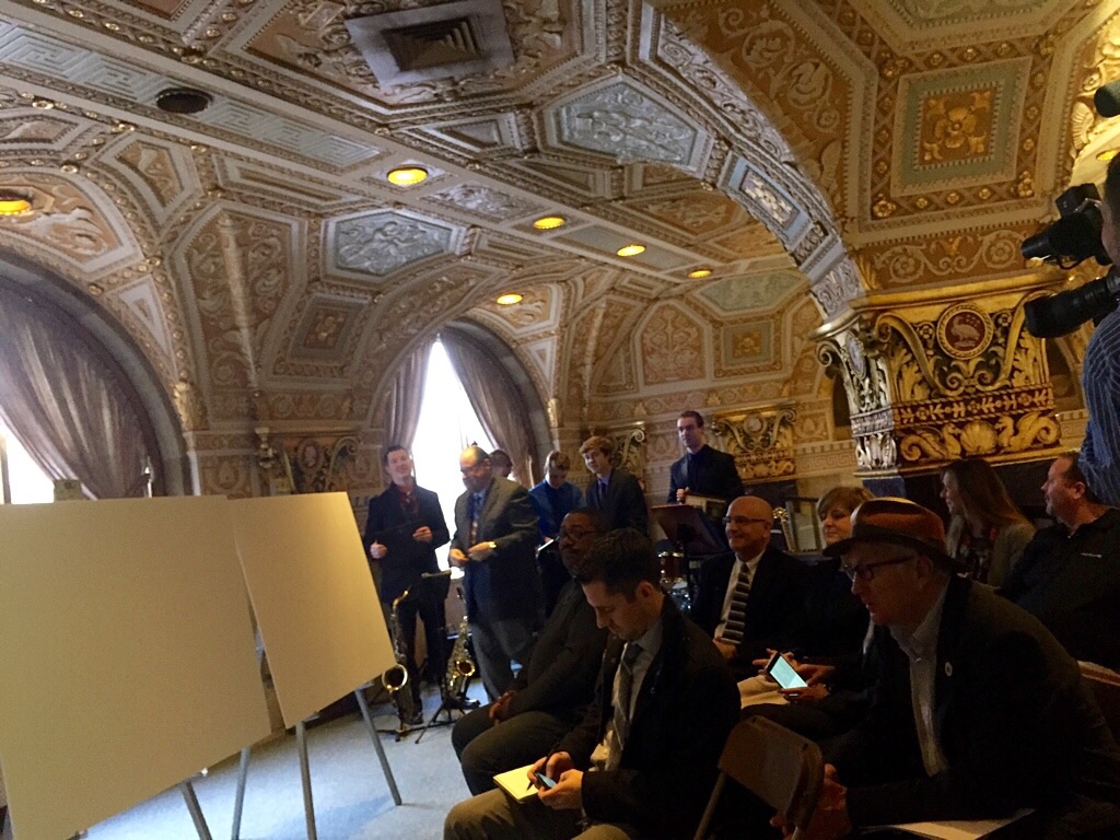 Back at the M&T Syracuse Jazz Fest news conference in the downtown bank lobby, fest founder and director Frank Malfitano hangs with the young musicians of band Notified as press and dignitaries wait for the unveiling of the acts.