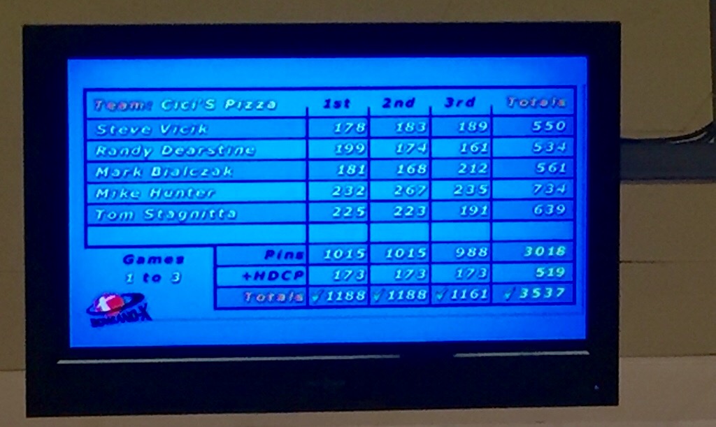 With red-hot Mike Hunter subbing for Tiny, who was hunting with his pals, we swept, taking all seven points. Mike is a scratch bowler. That means he carries a high average, well above 200. He’s subbed for us in season’s past. Tom picked well.