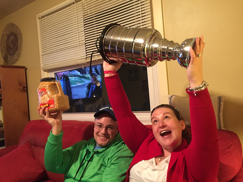 And Karen, while perusing a catalog, spotted the perfect gift for hockey-loving Elisabeth and George Three. They indeed did their popcorn maker built in the shape of the Stanley Cup given each year to the champion of the NHL. And that’s a big supply of popcorn George is hoisting in the time-tested hockey tradition beside the cup.