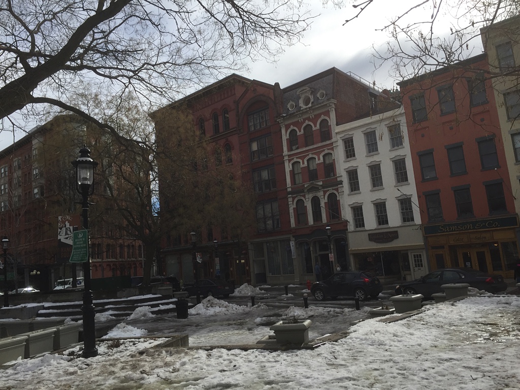 By early afternoon, Saturday, though, the big tower down Warren Street told my dear wife Karen and I that it was in the mid-50s. Good thing. I had left my winter jacket back home in the Little Bitty in the Syracuse city neighborhood of Eastwood, going for the layers of my blue 2014 Martinfest T-shirt to start, my New York Islanders long-sleeve T over that, my Syracuse Orange hoodie third, and this year’s Orange Martinfest T on top.