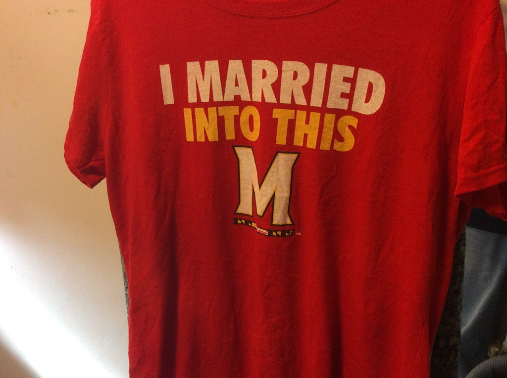 So I searched online to find the “I Married into This” logo T for her. It came by mail too late to give her on Valentine’s Day proper, but her smile was wide nevertheless, and she put it on as we watched Maryland top Michigan on TV on the DVR last Sunday.