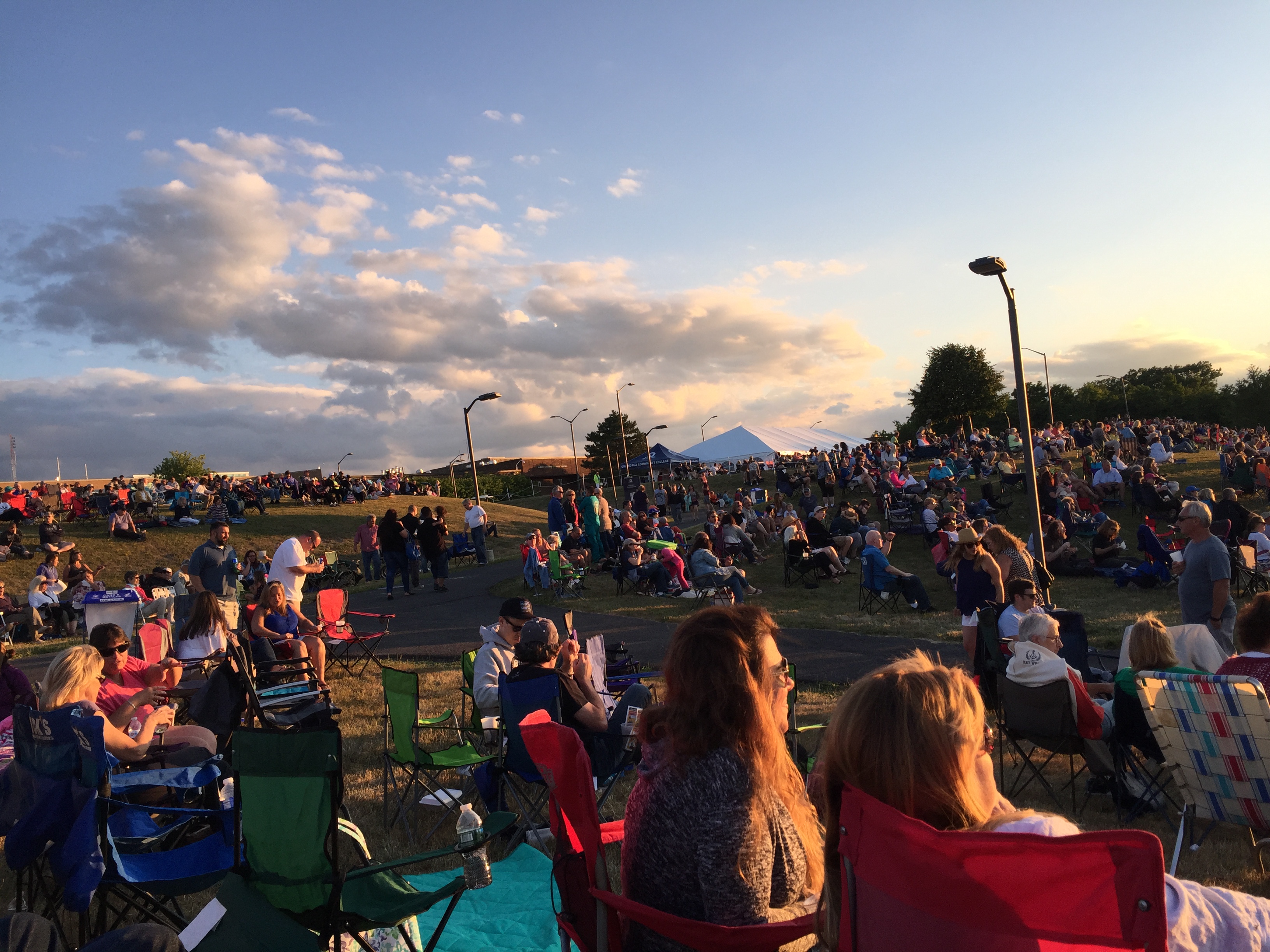 We’d settled on a spot adjacent to the food court, slightly elevated on a grassy hill and kitty-corner from the big stage. If you look at the far-range photo in the gallery, you can see the location we chose. It gave us a nice viewing vantage point. The sun was setting into our eyes, a bit, but I would not complain.