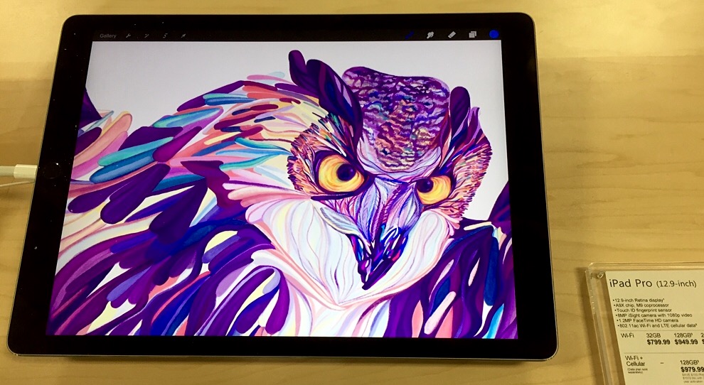 The 12.9-inch iPad Pro caught my attention. I have had this iPad Air 2 for almost two years now. I do use it every day to write this blog and more. I don’t own a laptop anymore. The Logitech Bluetooth keyboard stand broke again on top. They gave Karen pretty good trade-in value on her iPad Air 1 …