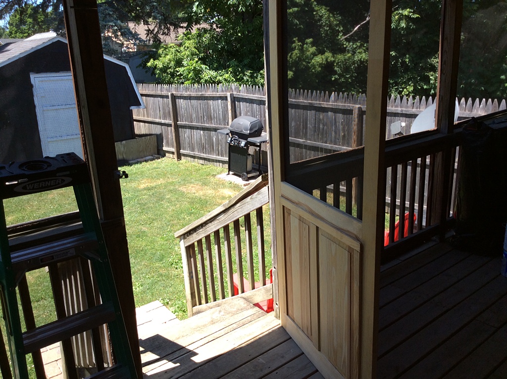 On Saturday we put up a new screen door, purchased from Lowe’s. It has a solid wood bottom. I borrowed some tools from Good Neighbor Tim to make the job easier.
