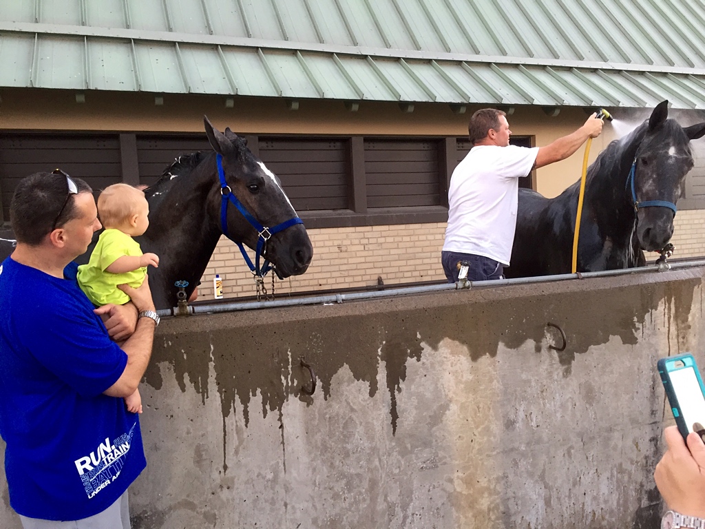 The horse building had a few caretakers hosing down their beautiful animals outside. We did not go in. I surmised that the heat must have been pretty high in there. In any case, this little one liked the guy with. The water cooling off his animal.