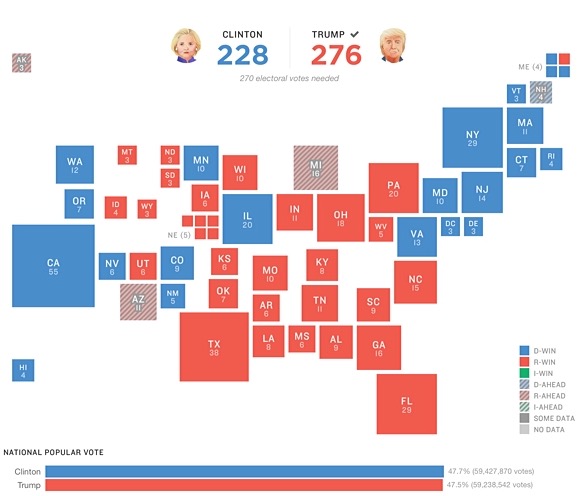 My state, New York, and the only other of the 50 that I resided in, for six of my coming-on 59 years of life, Maryland, were two of the few that gave its electorate college votes to Hillary Clinton.