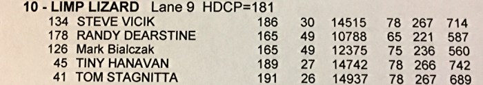 Anchor guy Tom helped us pull through without a catastrophic whitewash. In fact, we beat Keller Williams by enough pins to take total wood, too, to go away with three out of seven points. We’ll see where we stand when I look at the sheet before we roll tonight. It’s mighty bunched up behind the first-place squad, right down to 10th place.