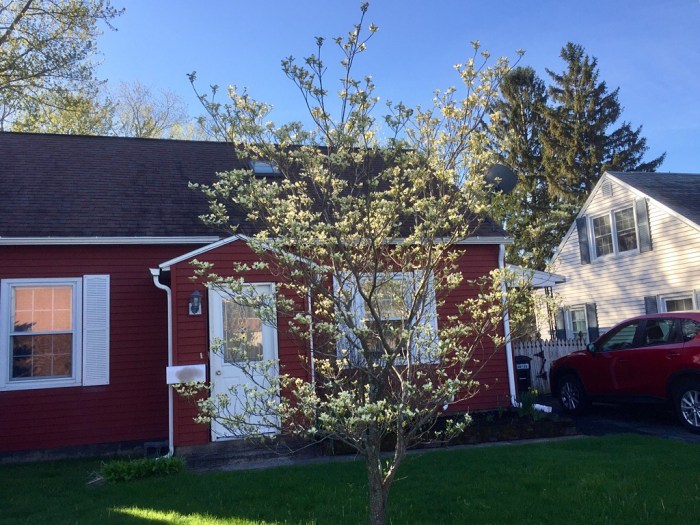 We’ve been wondering what color the tree smack dab in the middle of our front yard of A Bitty Better in the Liverpool neighborhood of Galeville would be, this being our first year here.