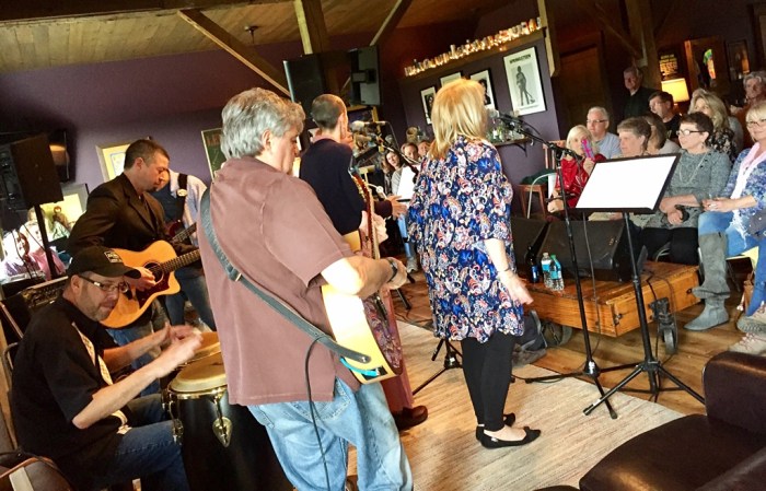 Popular, they are. We got to the golf course/tavern tucked away down Salt Springs Road with plenty of time to spare for the 5 p.m. Sunday start. And the only two chairs together left were way behind the stage and in the corner.