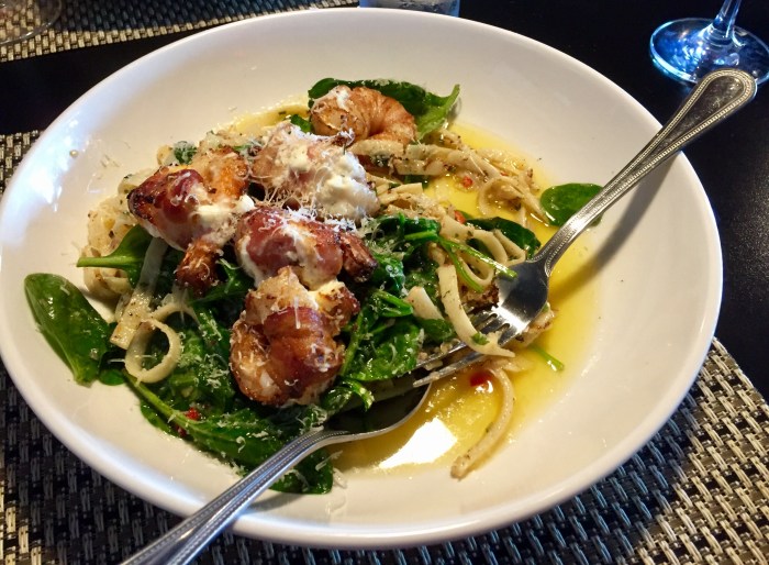 With a hundred-dollar bill warming my pocket from my bowling winnings, I was actually considering a bone-in rib eye with the add-on of a lobster tail, but that would have burned more than half the $100. Instead, my stomach growled when the waitress mentioned the night’s special: bacon-wrapped shrimp over vegetable pasta. Karen went for the salmon.