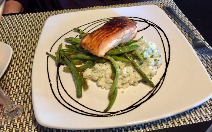 Karen really enjoyed her salmon, and reported that the asparagus, quite fresh, were green-bean like in taste. That was OK, she said. She said the risotto was fair.