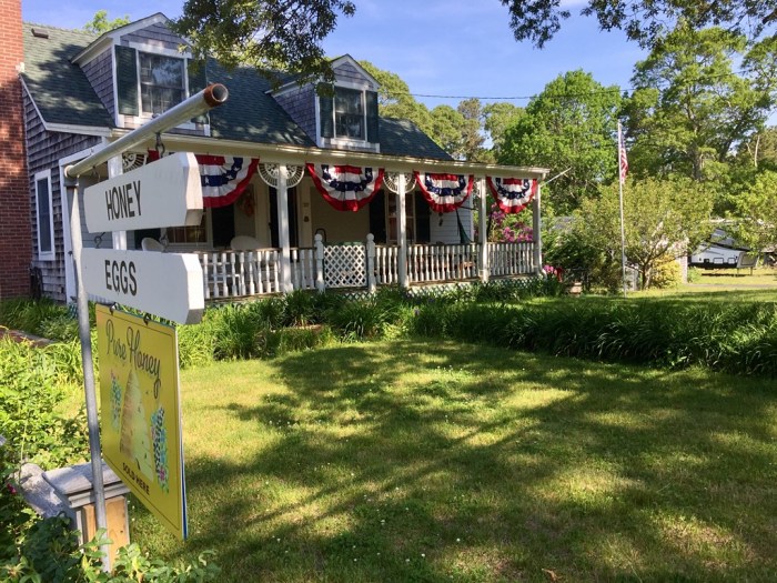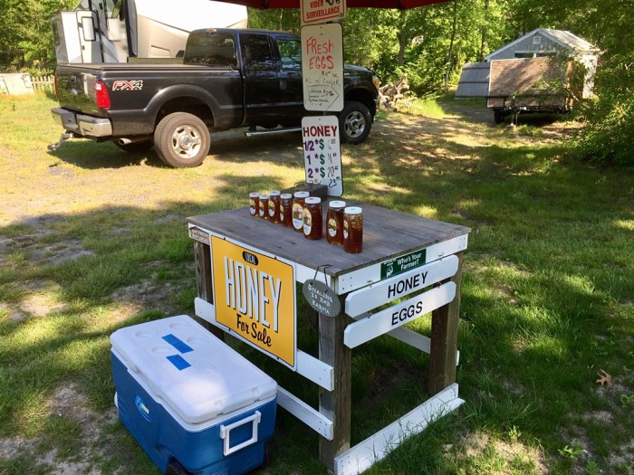 Our cherished rescue mutt indeed wants to sniff the eggs and the honey, but my dear wife Karen and I manage to pull her past with a whispered word.
