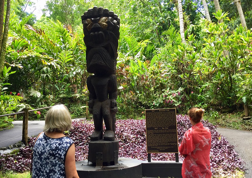 My dear wife Karen took in the legend of the tall tiki with another tourist.