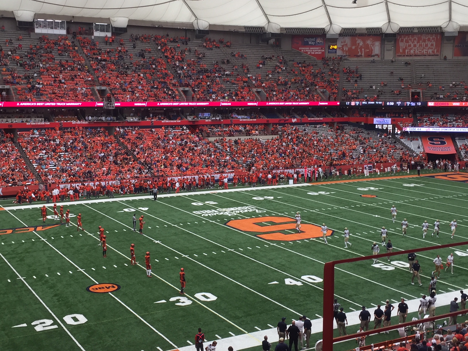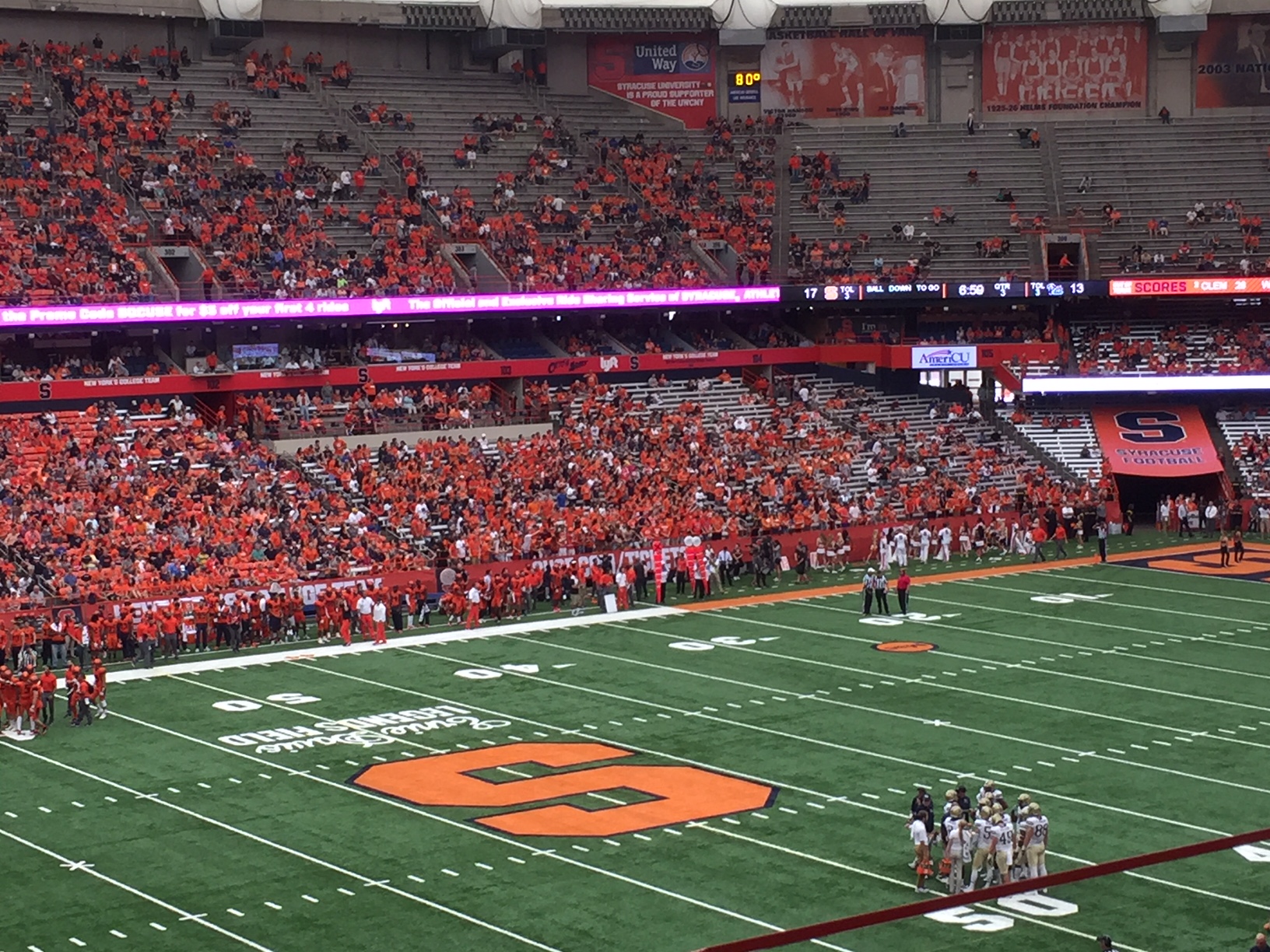 Syracuse was leading the Panthers when I snapped the shot above on my iPhone 6s. The home team held on to win 27-24, evening its record at 3-3. There are still bowl hopes for this season, if not great expectations to beat the undefeated defending national champs tonight.