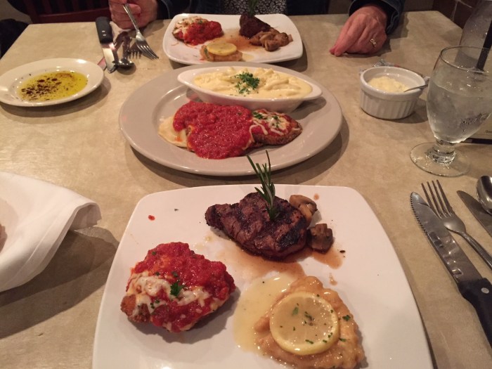 It would allow us to enjoy the soup, the appetizer assortment, entrees that included almost everything on both platters and other dishes we both loved, and cake and coffee. Did we have to choose from the chicken francaise, eggplant Parmesan, cavetelli Alfredo, chicken parm, ravioli and filet mignon, we wondered?
