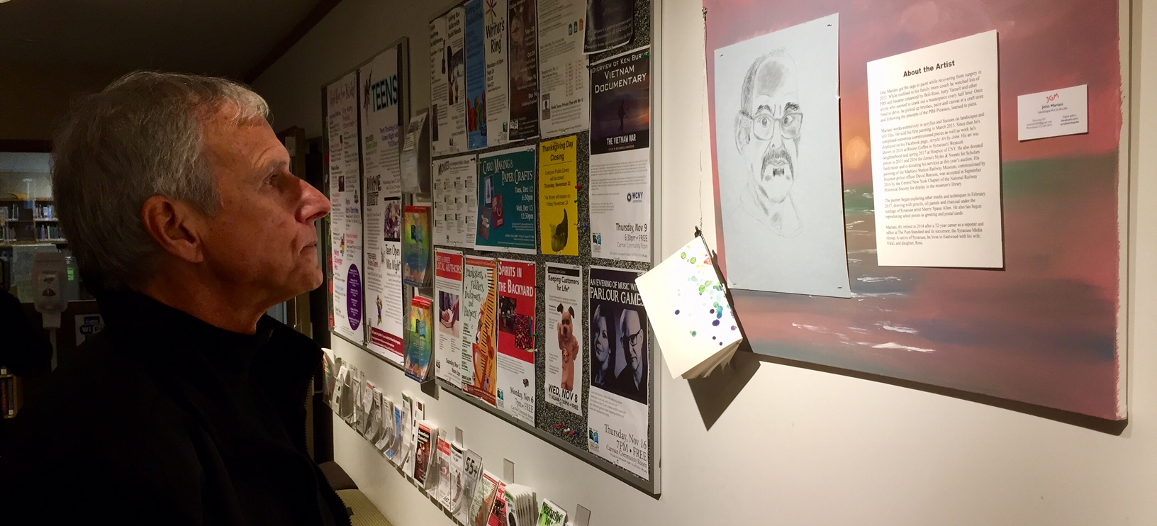 If you live in Central New York, Mariani’s 16 pieces hang on four lobby walls through November.