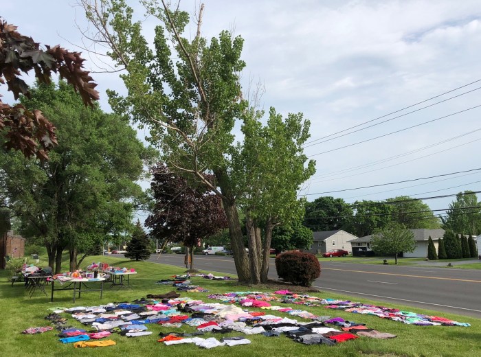 The way the sellers had spread out their ample supply of clothing caught my eye. I grabbed my iPhone 8 out of my pocket as I schlepped the blue cheese dressing for our upcoming spaghetti dinner and the package of bacon for the next morning’s breakfast in the bag on my other arm.