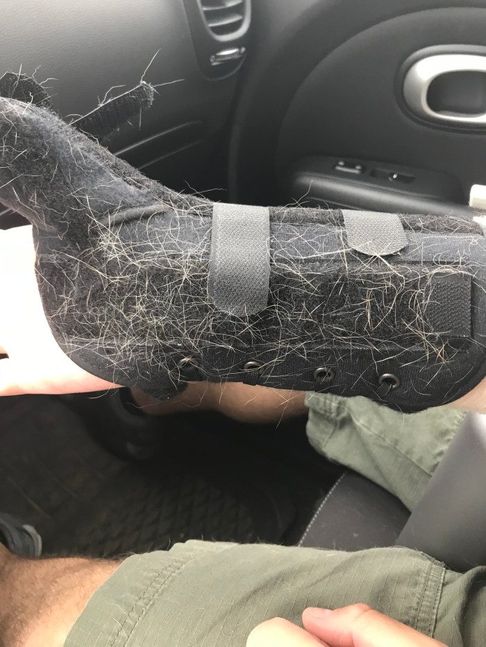 And then you can show what George’s wrist brace looked like after out cherished rescue mutt forced herself next to him on the couch in A Bitty Better in the Liverpool neighborhood of Galeville for, say, a couple of hours.