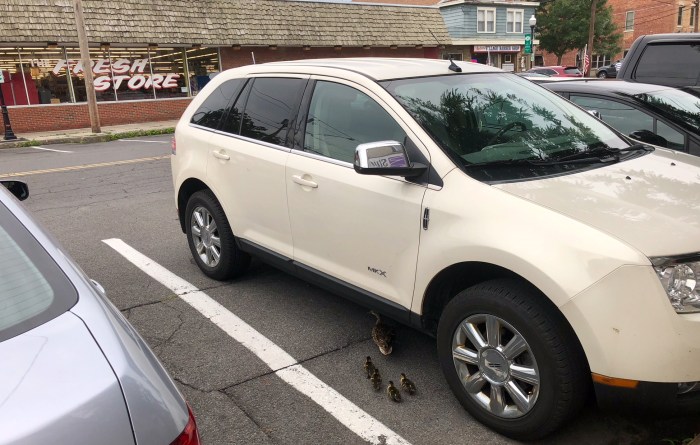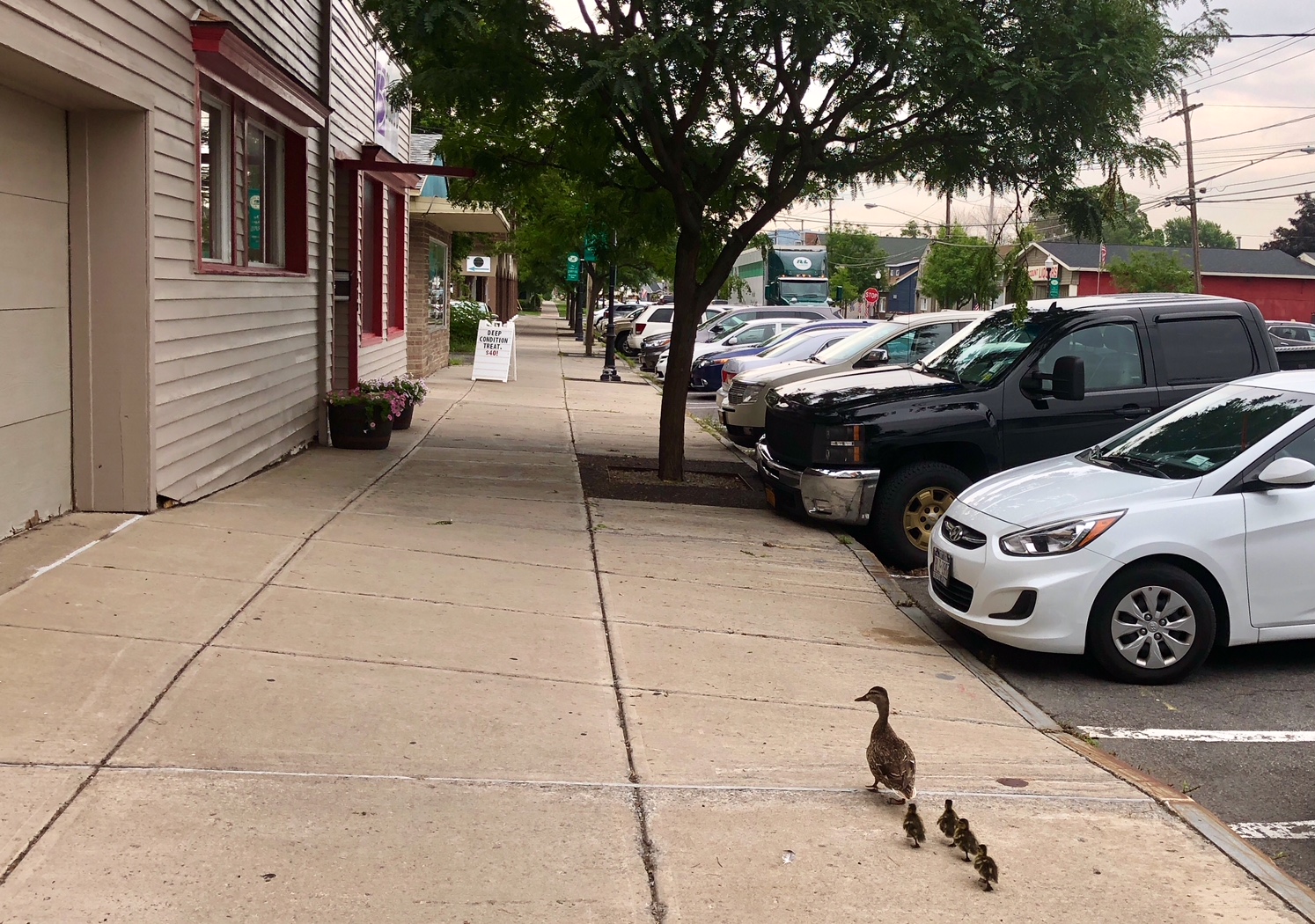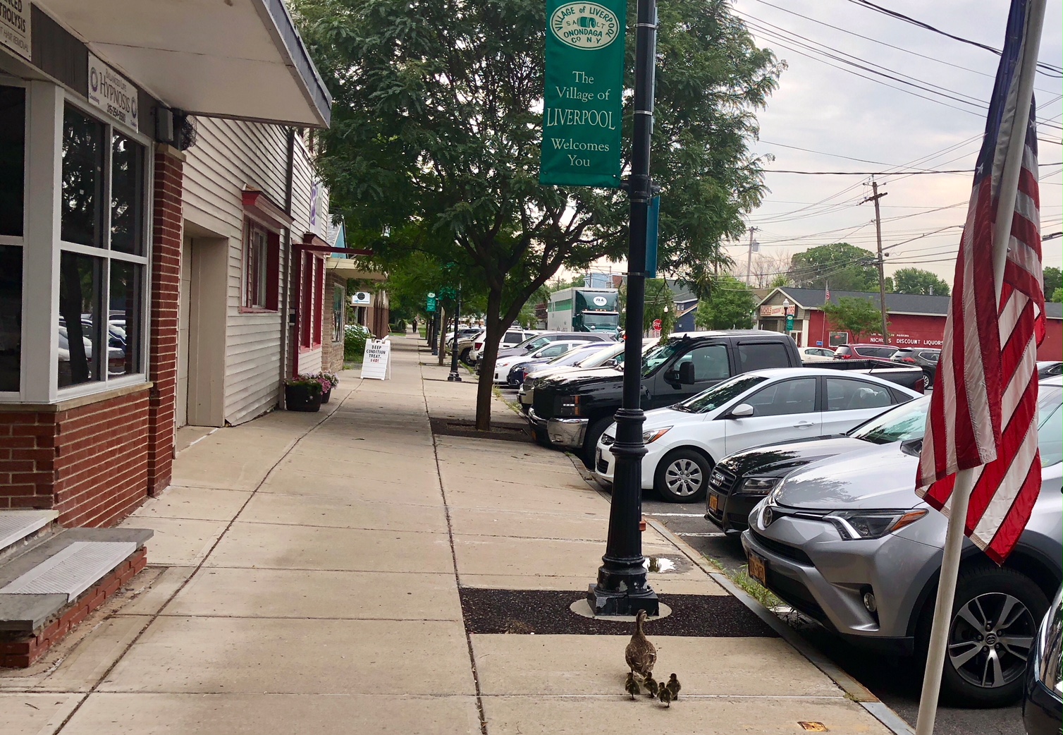 On a recent work break walk, we caught mama bird leading her brood from the street to the sidewalk in our Village of Liverpool street adjacent to the library.
