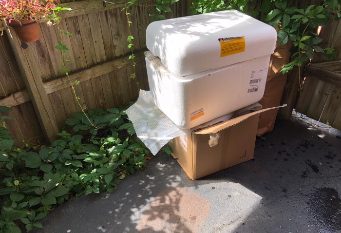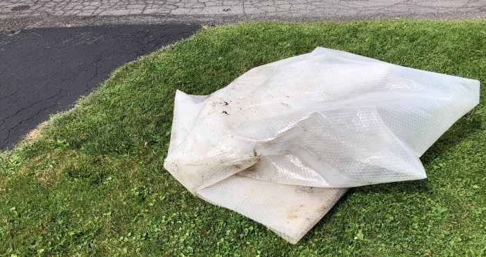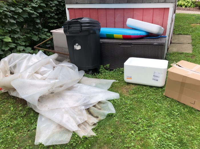 In the extensive opening process for this season, Karen saw how the pool company workers got rid of our old liner. They cut it up and put it to our curb in a box.